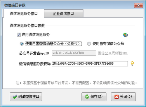 在功能導(dǎo)航窗點(diǎn)擊“擴(kuò)展應(yīng)用”,打開“微信接口參數(shù)”進(jìn)行配置。支持內(nèi)置微信消息公眾號(hào)和自有微信公眾號(hào)發(fā)送兩種方式,如下圖所示: