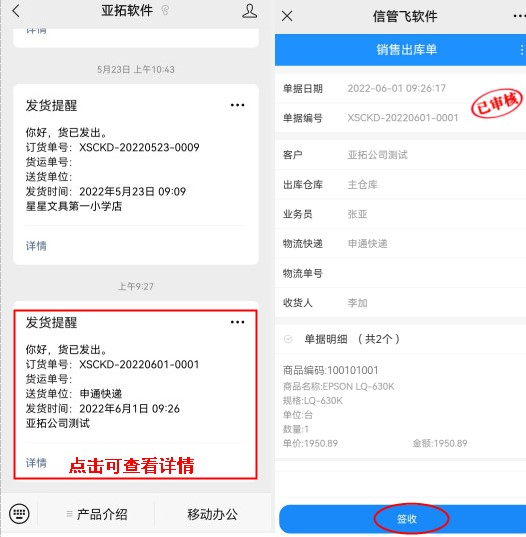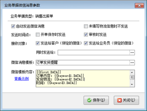 微信消息參數(shù)設(shè)置完成后,新開一個(gè)業(yè)務(wù)單據(jù),錄入單據(jù)信息后點(diǎn)擊保存按鈕,然后在工具欄“更多操作”下選擇“發(fā)送微信消息”。系統(tǒng)會(huì)根據(jù)消息模板自動(dòng)生成消息內(nèi)容(微信限制不允許修改),點(diǎn)擊“確認(rèn)發(fā)送”會(huì)通過微信公眾號(hào)發(fā)送一條消息給相應(yīng)的客戶。如設(shè)置保存或?qū)徍藭r(shí)自動(dòng)發(fā)送微信消息,則不需要手工操作,軟件會(huì)自動(dòng)發(fā)送微信消息給相應(yīng)的客戶或業(yè)務(wù)員。
