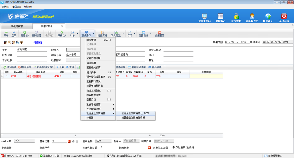 微信消息參數設置完成后,新開一個業務單據,錄入單據信息后點擊保存按鈕,然后在工具欄“更多操作”下選擇“發送企業微信消息”。系統會根據消息模板自動生成消息內容,點擊“確認發送”會發送一條消息。
