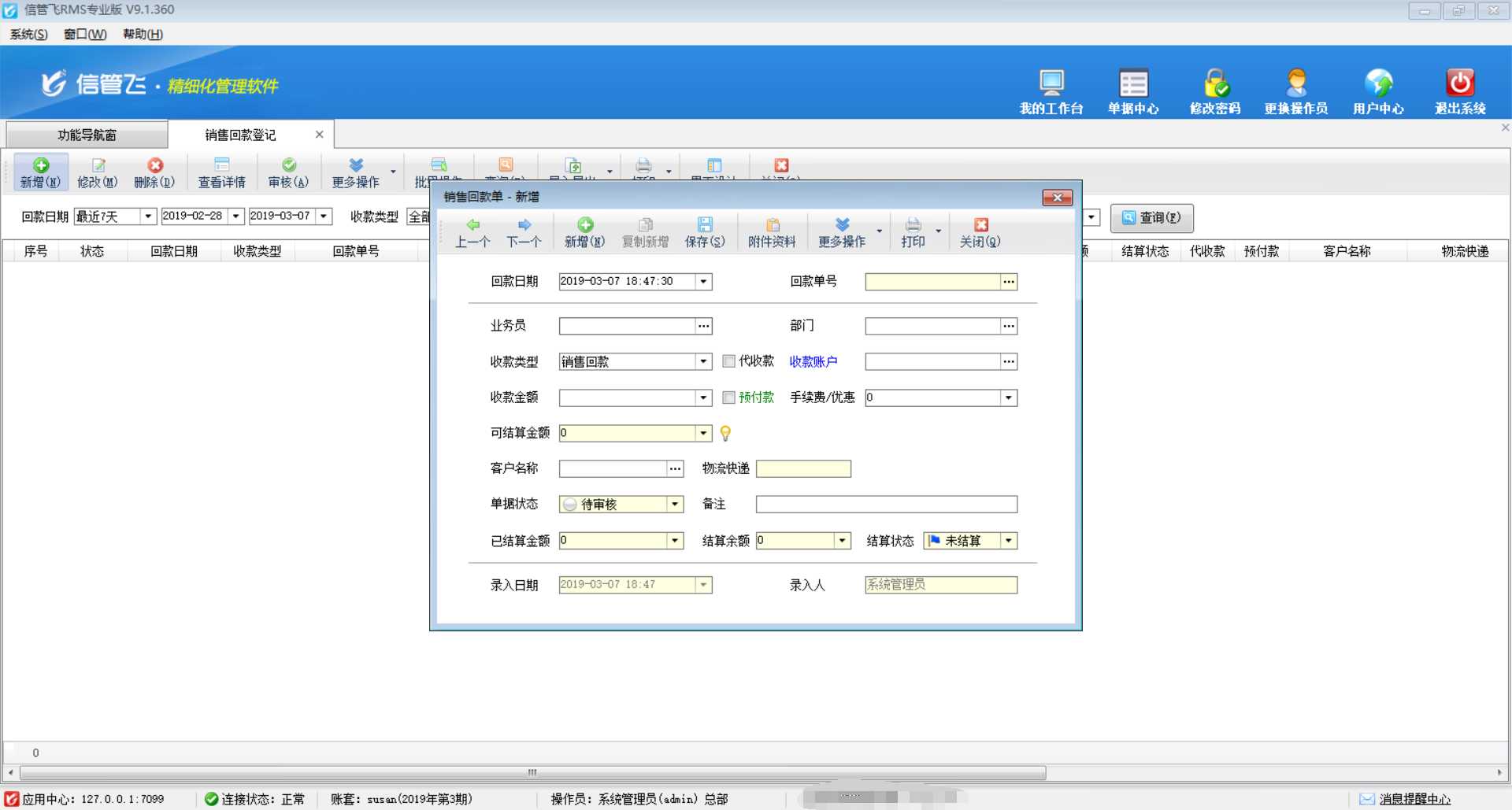 2、銷(xiāo)售收款按照業(yè)務(wù)員進(jìn)行登記歸集,支持銷(xiāo)售退款、沖賬、預(yù)支沖賬、代收款等特殊結(jié)算資金管理。
