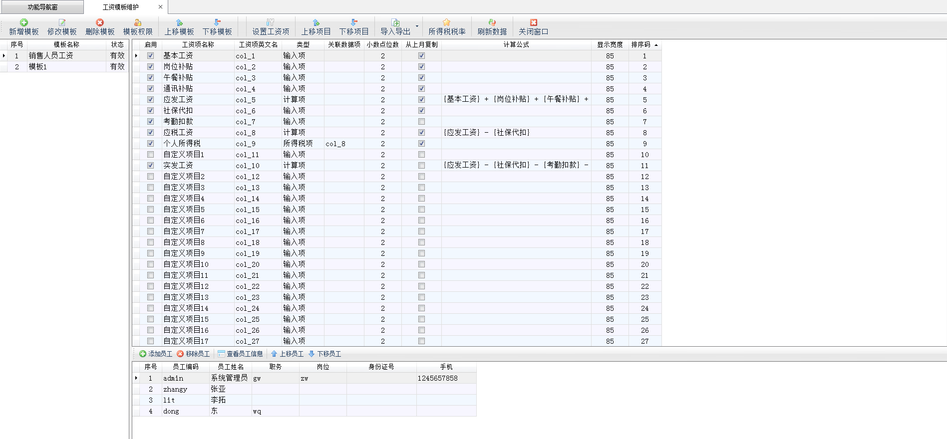 上移模板、下移模板:在工具欄點(diǎn)擊“上移模板”、“下移模板”可以調(diào)整工資模板的顯示順序。