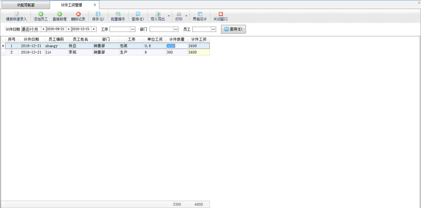 添加員工:點(diǎn)擊工具欄的“添加員工”按鈕,可選擇員工信息添加到計(jì)件工資管理列表。
