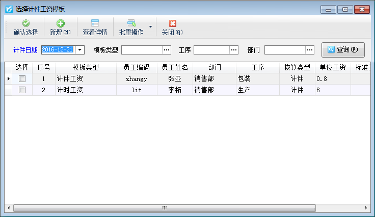 查詢:可以根據(jù)模板類型、工序、部門、員工、核算類型等條件進(jìn)行查詢計(jì)件工資模板。