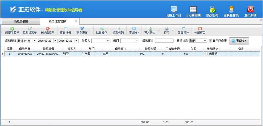 ????在功能導(dǎo)航窗點(diǎn)擊“綜合管理”—》“員工借款管理”即可進(jìn)入“員工借款管理”界面,如下圖所示: