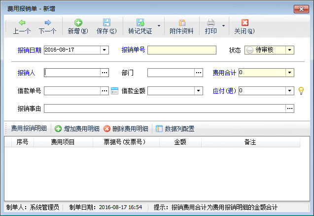 ????錄入報(bào)銷日期、報(bào)銷人、費(fèi)用合計(jì)、應(yīng)付(退)等必填項(xiàng)后保存單據(jù)即可,報(bào)銷單號(hào)保存后自動(dòng)生成。