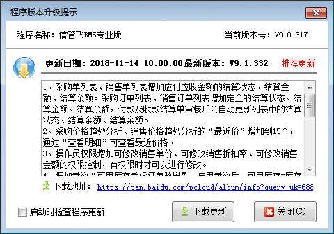 ????在功能導航窗點擊“系統管理”—》“升級更新”即可檢查程序更新,如有新版本,會彈出“程序版本升級提示”,點擊“下載更新”按鈕即可更新最新版本,其界面如下圖所示。