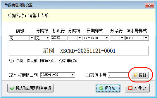流水號規則設置:點工具欄中的“流水號規則設置”,可以配置單據流水號的生成規則。配置各類單據按各自流水號遞增,還是所有單據采用統一流水號遞增;流水號每年、每月、每天從 1 遞增,還是一直遞增。