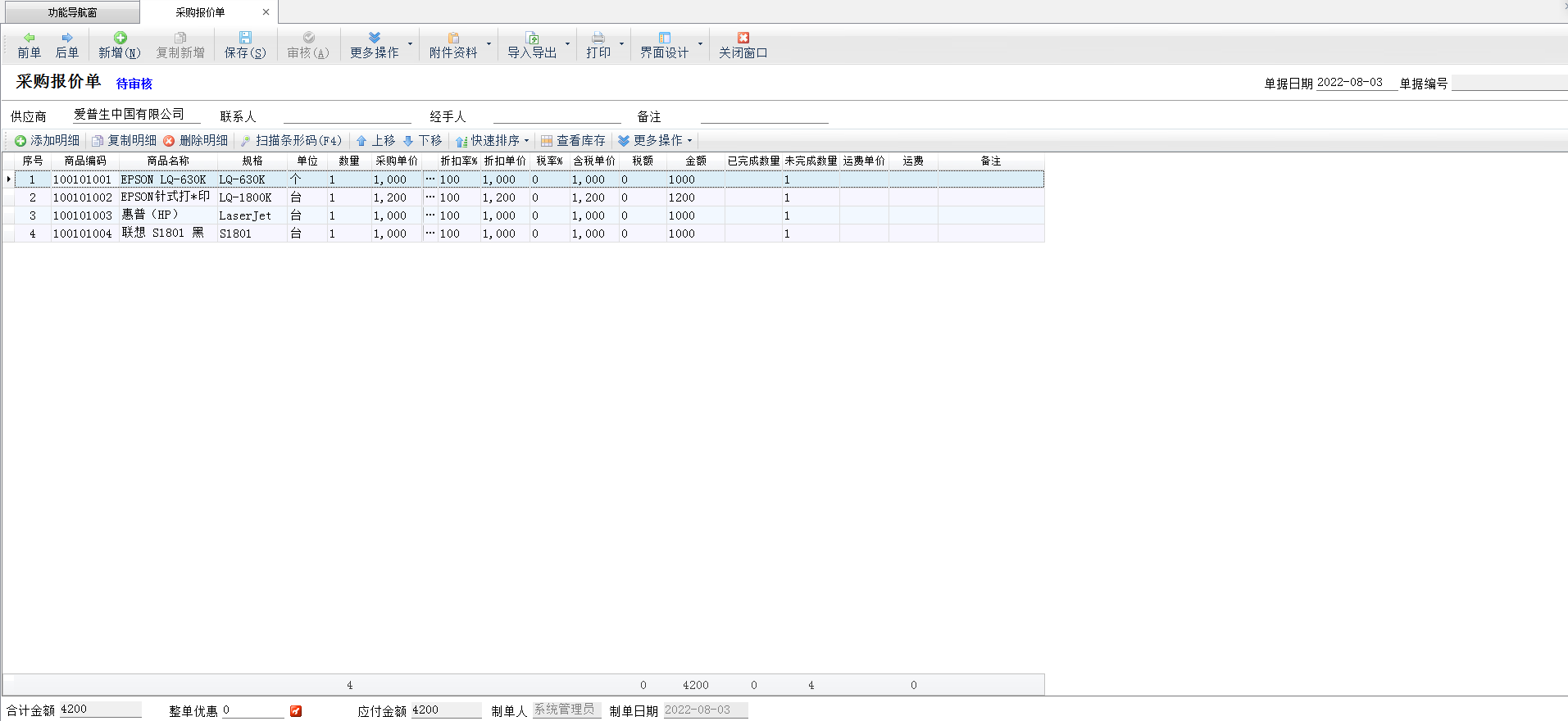 ????采購報價單用于管理采購詢價信息,相對于采購訂單,報價單的采購意向更弱。在采購訂單和采購入庫單中可以調取引用采購報價單。