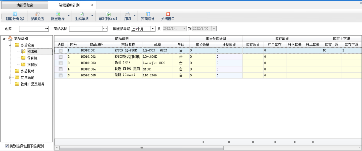 ????在功能導航窗點“采購管理”—》“智能采購計劃”即可進入本功能,如下圖所示: