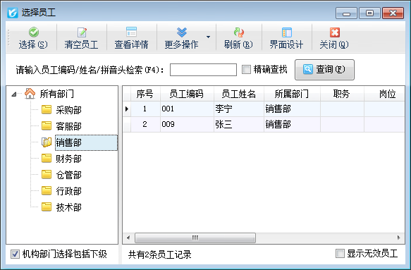 經手人:必填項,點擊選擇經手人按鈕,彈出“選擇員工”窗口,如下圖所示: