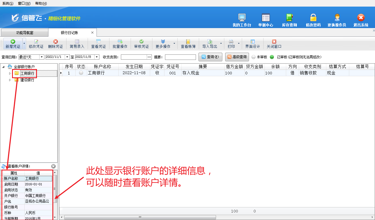 ????在功能導航窗點“出納管理”—》“銀行日記賬”即可進入“銀行日記賬”界面,如下圖所示:
