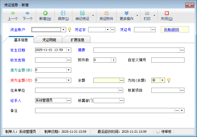 (7)更多操作:可以對已審核過的單據進行紅沖、轉記出納憑證、查看辦理過程等。