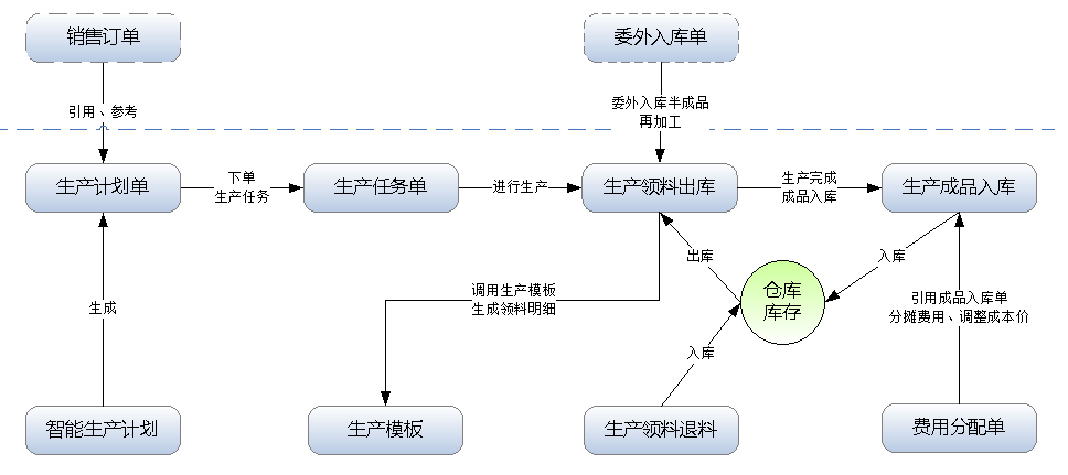 引單:委外領料單可以引用“委外加工單”,并將加工單中的產品明細作為單據的生產明細,同時如果相應的商品有生產模板則自動根據生產模板生成領料明細。