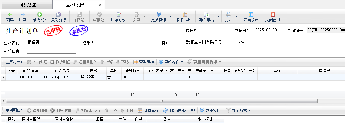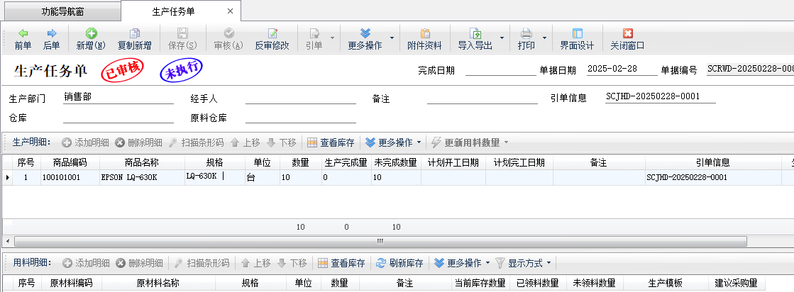 用料明細:根據生產模板可自動生成相應的用料明細,也可以手工錄入或不錄入用料明細。