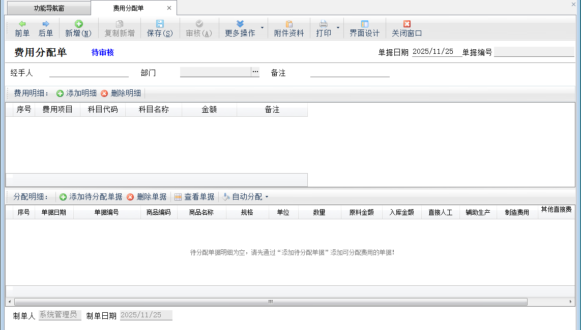 費用明細:可以添加費用明細,輸入金額即可。在添加費用窗口可以新增加費用以及對應的會計科目。默認添加的費用其分配狀態為“未分配”。