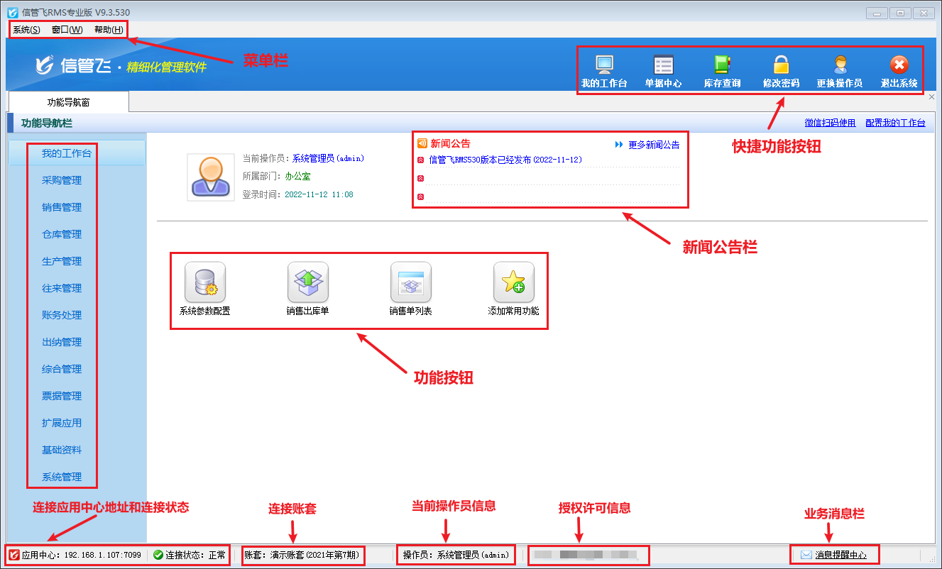 狀態欄:狀態欄顯示應用中心地址、與應用中心的連接狀態、當前登錄的賬套、當前操作員信息、業務提醒消息。