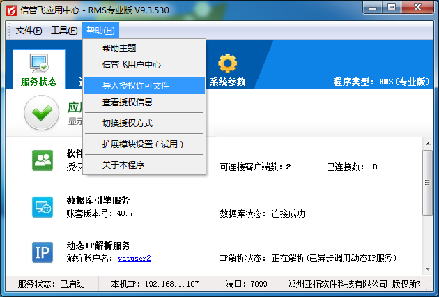 ????在軟件升級(如單機版升級為網絡版,網絡版增加用戶數時),使用加密鎖形式授權時,點菜單“幫助”—》“導入授權文件”,輸入授權序列號,然后點“獲取授權”按鈕可以從信管飛云應用中心獲取最新的授權許可,獲取授權許可信息后,請重啟信管飛應用中心程序即可。使用授權號授權時,點菜單“幫助”—》“獲取授權許可”,點擊獲取授權按鈕,獲取授權許可信息后,請重啟信管飛應用中心程序即可。