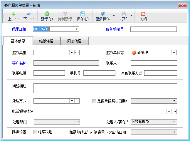 ????新增服務單:點工具欄中的“新增服務單”按鈕,可以增加服務單信息。在受理階段需要填寫受理日期、服務單編號、服務類型、相關客戶和聯系人、問題描述等信息。如果是保修產品性質的客戶服務,還需要登記故障產品的信息。