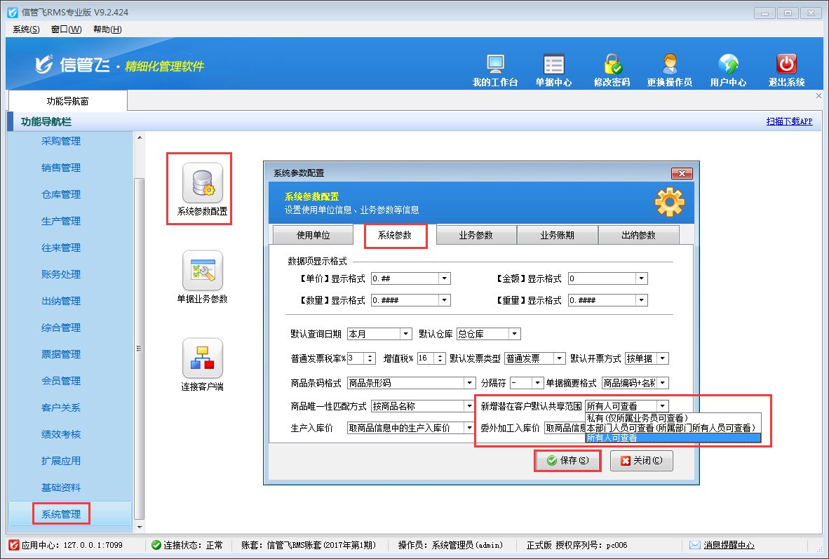 ????在功能導航窗中點擊“系統管理”—》“系統參數配置”,即可進入“系統參數設置”界面,其界面如下圖所示。此處我們把新增潛在客戶默認共享范圍設置為“所有人可查看”,然后點擊“保存”按鈕保存設置。