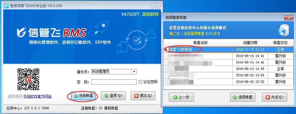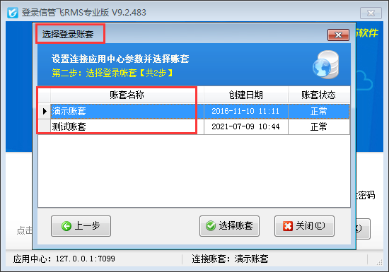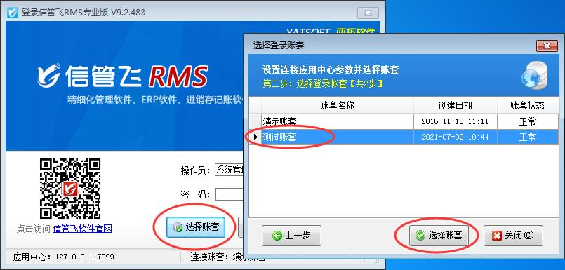 ????運行信管飛RMS客戶端(藍色圖標),在軟件登錄界面點擊“選擇賬套”,在“選擇登錄賬套”界面選擇我們所需要的賬套,然后登錄軟件即可。