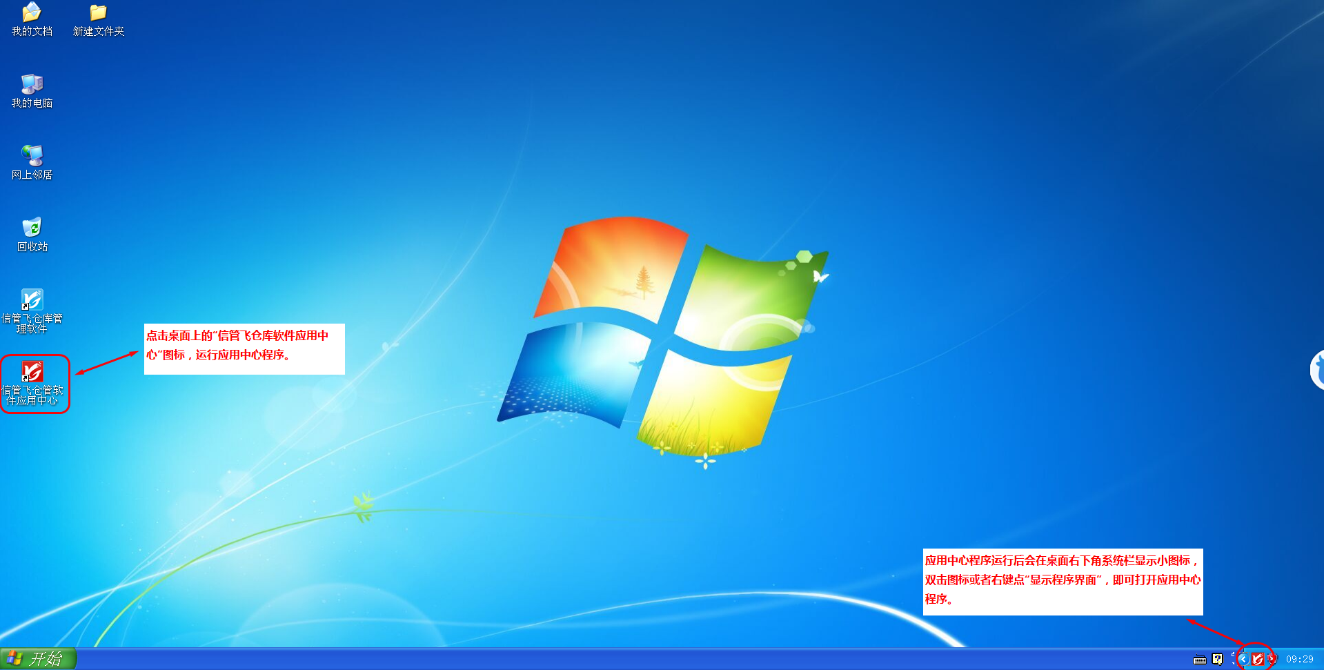 ????運行信管飛倉庫管理軟件應用中心并打開信管飛倉庫管理軟件應用中心程序界面,主機電腦上軟件安裝后會在桌面上自動創建“信管飛倉庫管理軟件應用中心(紅色圖標)”及“信管飛倉庫管理軟件即客戶端(藍色圖標)”的快捷方式,點擊“信管飛倉庫管理軟件應用中心(紅色圖標)”即可運行信管飛倉庫管理軟件應用中心,如下圖所示。