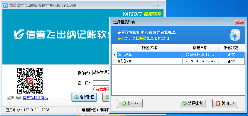 ????重新運行應用中心后,電腦右下角會顯示應用中心圖標。然后打開客戶端程序(藍色圖標),登錄界面點擊“選擇帳套”,然后下一步,然后會出現“選擇登錄帳套”窗口,此時顯示的可登錄的帳套列表。剛才已停用的“演示賬套0306”已不在列表內,無法選擇到了,如下圖所示。