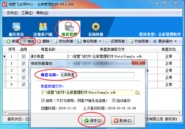 ????以“信管飛倉庫管理軟件”為例,示范下如何修改賬套的名稱。打開紅色的應用中心程序(應用中心運行后桌面右下角會顯示相應的圖標,點擊即可打開應用中心主界面),在賬套管理界面,點擊賬套后選擇工具欄中的“修改”按鈕,彈出“修改賬套屬性”界面,把“演示賬套”修改為“倉庫賬套”,然后點擊“保存”按鈕,如下圖所示: