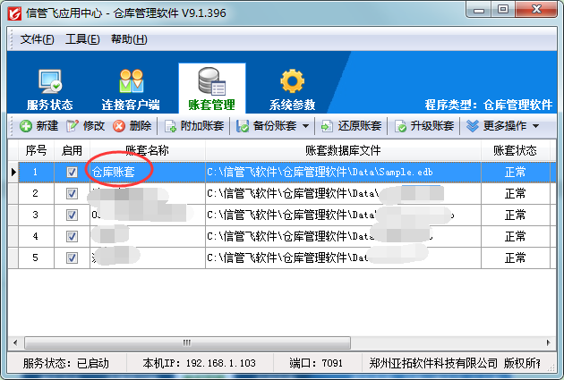 ????信管飛RMS、信管飛倉庫管理軟件、信管飛送貨單軟件、信管飛出納記賬軟件、信管飛票據打印軟件等軟件都含有賬套管理功能,在應用中心內支持建立多個賬套,已使用的帳套如果不再繼續使用,可以停用帳套,停用帳套后,客戶端程序登錄時將無法再連接該帳套。本文我們以信管飛倉庫管理軟件為例演示一下如何停用帳套。