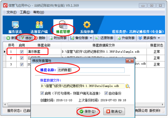????以“信管飛出納記賬軟件”為例,示范下如何修改賬套的名稱。打開紅色的應用中心程序(應用中心運行后桌面右下角會顯示相應的圖標,點擊即可打開應用中心主界面),在賬套管理界面,點擊賬套后選擇工具欄中的“修改”按鈕,彈出“修改賬套屬性”界面,把“演示賬套”修改為“出納賬套”,然后點擊“保存”按鈕,如下圖所示:
