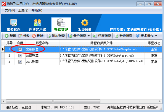 ????亞拓軟件旗下的信管飛RMS、信管飛倉庫管理軟件、信管飛送貨單軟件、信管飛出納記賬軟件、信管飛票據打印軟件等軟件程序安裝后會顯示兩個圖標,一個是應用中心程序(紅色圖標),一個是客戶端程序(藍色圖標)。這些軟件都含有賬套管理功能,在應用中心里面可以建立多個賬套,已使用的帳套如果不再繼續使用,可以停用帳套,停用帳套后,客戶端程序登錄時無法連接該帳套。我們以信管飛出納記賬軟件專業版為例演示一下如何停用帳套。