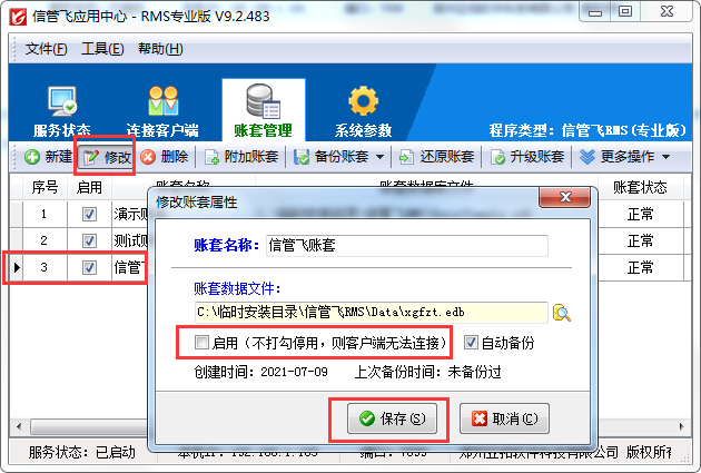 ????應用中心(紅色圖標)打開后會在電腦的右下角顯示,雙擊打開電腦右下角的應用中心圖標,點擊“帳套管理”,如圖所示,帳套列表一共有3個帳套啟用,現在我們對第三個帳套“信管飛帳套”進行停用。選擇帳套后,點擊“修改”按鈕,系統彈出修改帳套屬性窗口,把“啟用”的打勾取消,然后點擊“保存”按鈕。