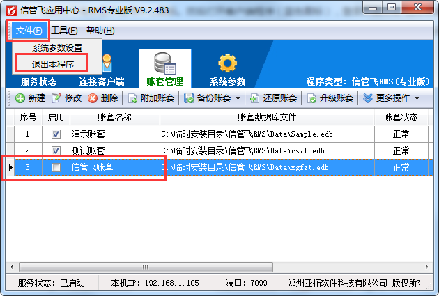 ????亞拓軟件旗下的信管飛RMS、信管飛倉庫管理軟件、信管飛送貨單軟件、信管飛出納記賬軟件、信管飛票據打印軟件等新架構程序軟件安裝后會顯示兩個圖標,一個是應用中心程序(紅色圖標),一個是客戶端程序(藍色圖標)。這些軟件都含有賬套管理功能,在應用中心里面可以建立多個賬套,已使用的帳套如果不再繼續使用,可以停用帳套,停用帳套后,客戶端程序登錄時無法連接該帳套。我們以信管飛RMS為例演示一下如何停用帳套。