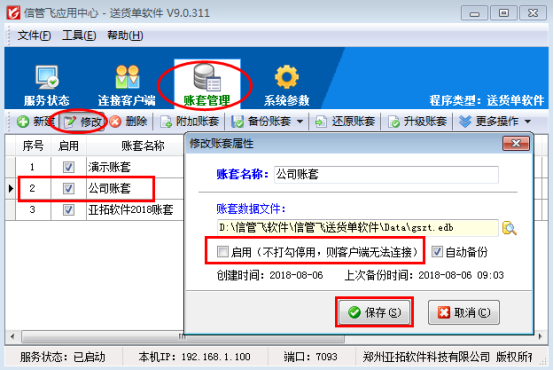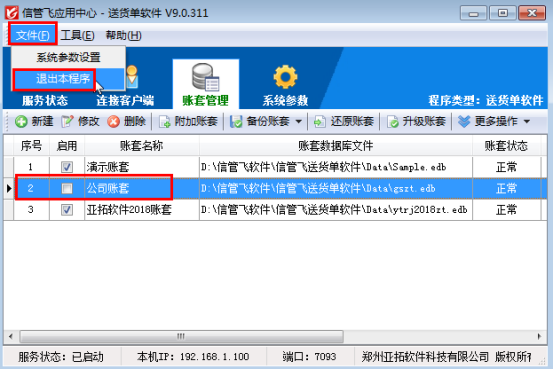 ????亞拓軟件旗下的信管飛RMS、信管飛倉庫管理軟件、信管飛送貨單軟件、信管飛出納記賬軟件、信管飛票據打印軟件等軟件程序安裝后會顯示兩個圖標,一個是應用中心程序(紅色圖標),一個是客戶端程序(藍色圖標)。這些軟件都含有賬套管理功能,在應用中心里面可以建立多個賬套,已使用的帳套如果不再繼續使用,可以停用帳套,停用帳套后,客戶端程序登錄時無法連接該帳套。我們以信管飛送貨單軟件為例演示一下如何停用帳套。