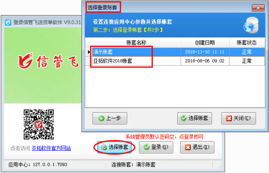 ????運行信管飛送貨單軟件客戶端(藍色圖標),在軟件登錄界面點擊“選擇賬套”,在“選擇登錄賬套”界面選擇我們所需要的賬套,然后登錄軟件即可。