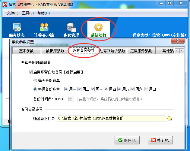????本文以信管飛倉庫管理軟件為例,介紹下如何修改賬套備份存儲目錄,打開應用中心程序(紅色圖標),點擊“系統參數”進入參數設置界面,選擇“賬套備份參數”,在賬套備份目錄設置中,可以修改默認目錄,如下圖所示: