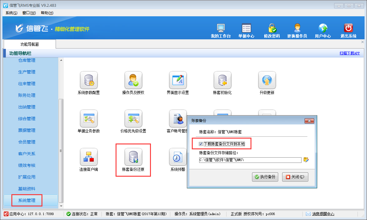 ????登錄信管飛RMS客戶端,在功能導航窗中點擊“系統管理”——“賬套備份”同樣可以執行賬套備份操作,如下圖所示。