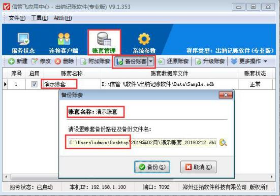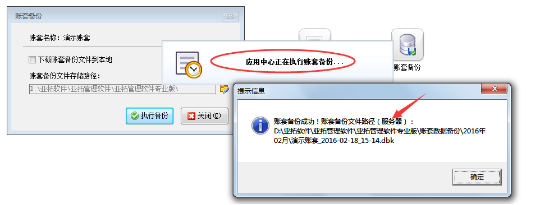 ????設置好備份目錄后,返回至應用中心程序“賬套管理”界面,選擇一個賬套,點擊“備份賬套”可以看到彈出的備份賬套的界面保存目錄為設置的保存目錄“桌面”上,如下圖所示: