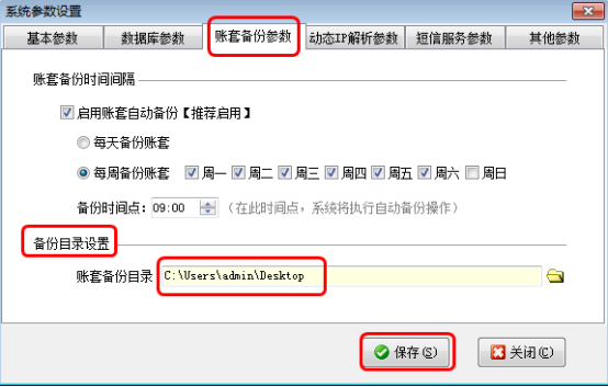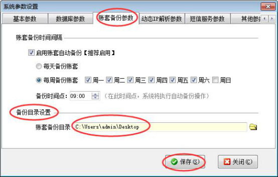 ????另外在“系統參數”——“賬套備份參數”中可以設置是否啟用自動備份、備份時間間隔和備份目錄。我們強烈建議啟用自動備份,以便賬套出現問題的時候從賬套備份文件中恢復數據。