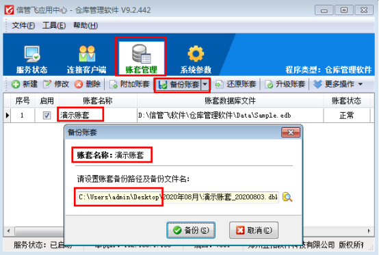 ????二、在信管飛倉庫管理軟件客戶端程序中執行賬套備份