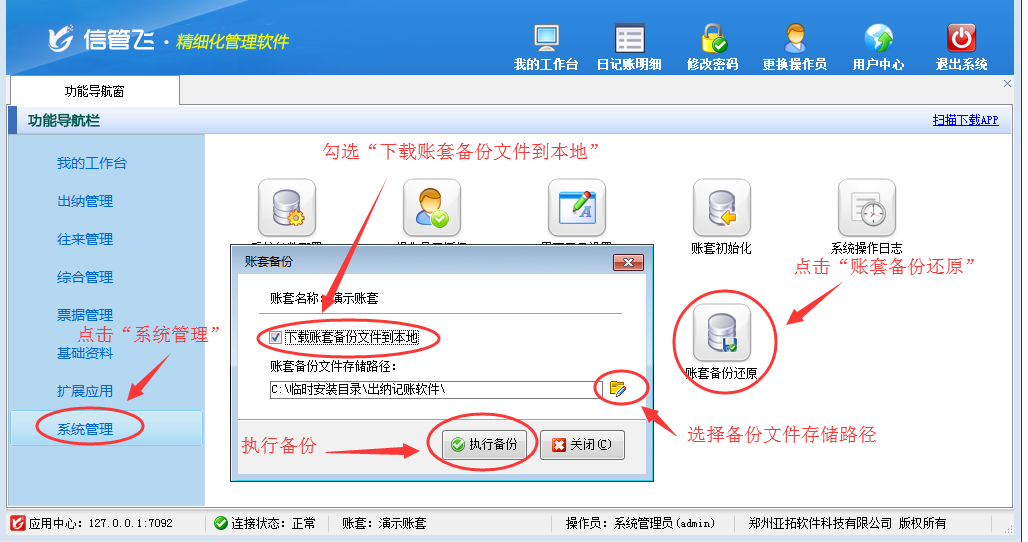 ????云賬套版本數據默認存儲在云服務器上,需要換到本地版使用,在云賬號即將到期時打開“系統管理”—》“賬套備份還原”,在賬套備份還原界面點擊“執行備份”,執行備份完成,選擇下備份文件,點擊“下載備份文件”到選擇的存放目錄中,隨后點擊“開始下載”,完成后則云賬套數據備份下載到本地存放目錄中,如下圖所示: