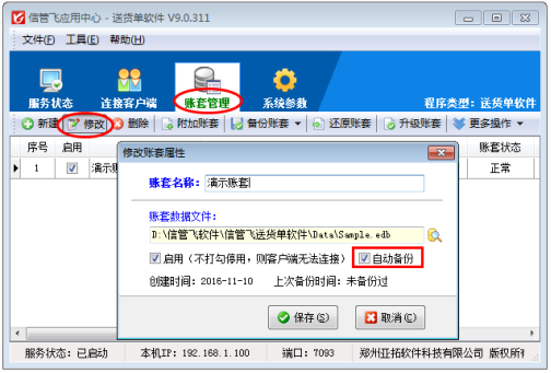 ????以“信管飛送貨單軟件”為例,示范下如何修改賬套的名稱。打開紅色的應用中心程序(應用中心運行后桌面右下角會顯示相應的圖標,點擊即可打開應用中心主界面),在賬套管理界面,點擊賬套后選擇工具欄中的“修改”按鈕,彈出“修改賬套屬性”界面,把“演示賬套”修改為“送貨單賬套”,然后點擊“保存”按鈕,如下圖所示: