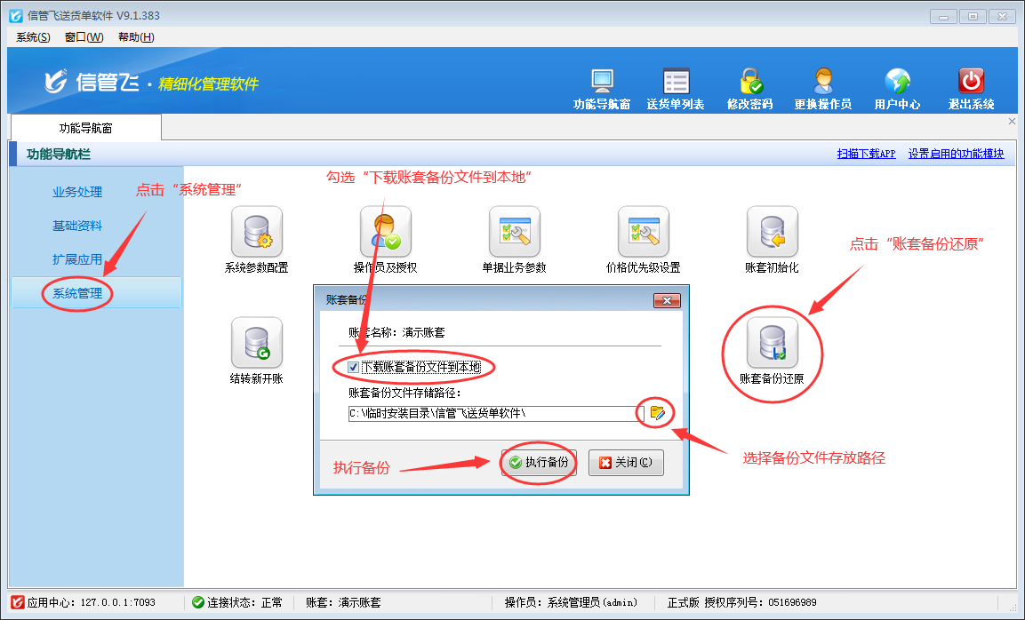 ????信管飛倉庫管理軟件、信管飛出納記賬軟件、信管飛送貨單軟件、信管飛RMS等軟件賬套數據默認存儲在軟件安裝目錄下,支持對賬套數據進行備份,如需要更換主機電腦,需要在原來的主機電腦上備份賬套數據,將生成的備份文件復制到新的主機電腦上,然后在新的主機電腦上安裝軟件,使用備份文件還原數據即可。
