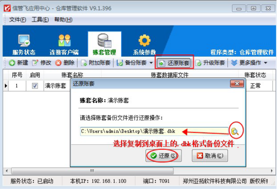 ????備份文件下載到本地后,如果需要本地版使用,需要重新購買本地版軟件,云賬號到期不再續費。本地版軟件需安裝應用中心程序(紅色圖標),購買軟件后把分配的授權在應用中心程序中獲取下,然后打開賬套管理界面點擊“還原賬套”,選擇下載到本地的云端備份文件,點擊還原即可。還原成功后,登錄本地版客戶端程序,可登錄查看數據,如下圖所示: