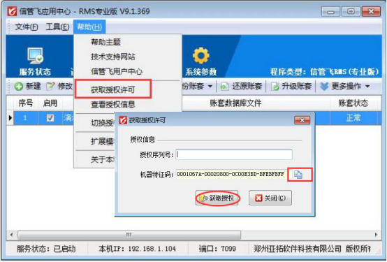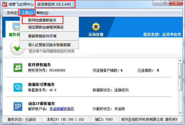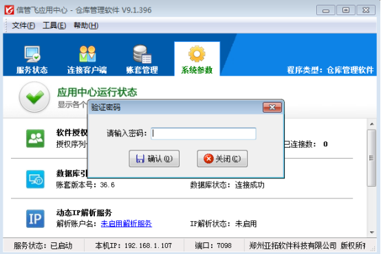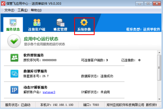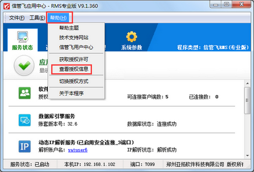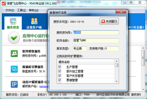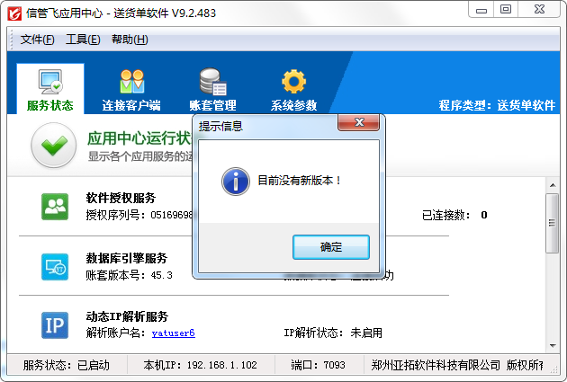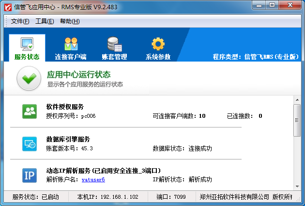 ????信管飛RMS、信管飛倉庫管理軟件、信管飛出納記賬軟件、信管飛送貨單軟件和信管飛票據打印軟件都由客戶端程序和應用中心程序兩部分組成,應用中心可以全面掌控軟件的運行情況,可以隨時查看各類服務的運行狀態,主要包括軟件授權服務情況、數據庫引擎服務情況、動態IP解析服務情況、手機短信服務情況等。下面我們以信管飛RMS專業版為例介紹一下應用中心的服務狀態。