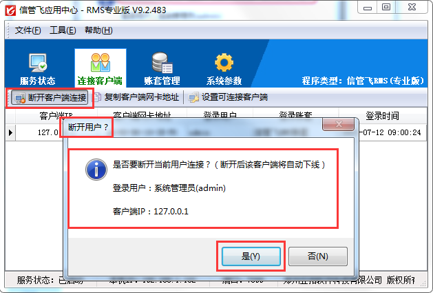 ????第一種解決方式:鼠標雙擊軟件界面最下方的“連接狀態:已斷開”字樣,系統會彈出“系統與應用中心的連接已斷開,是否嘗試重新連接?”提示信息,如圖所示,點“是”按鈕,客戶端程序會嘗試重新建立與應用中心程序的連接。如果連接成功即可打開相應的功能,繼續使用軟件。