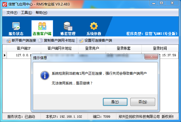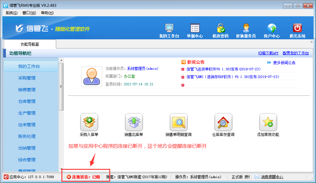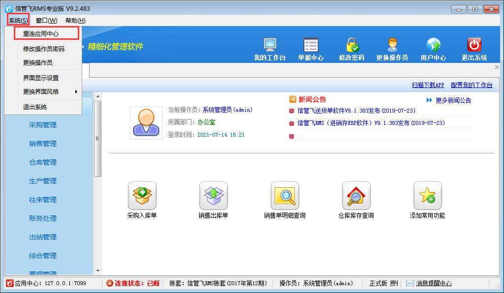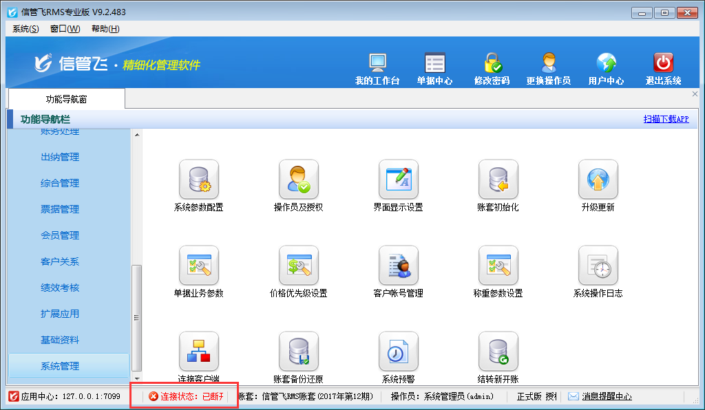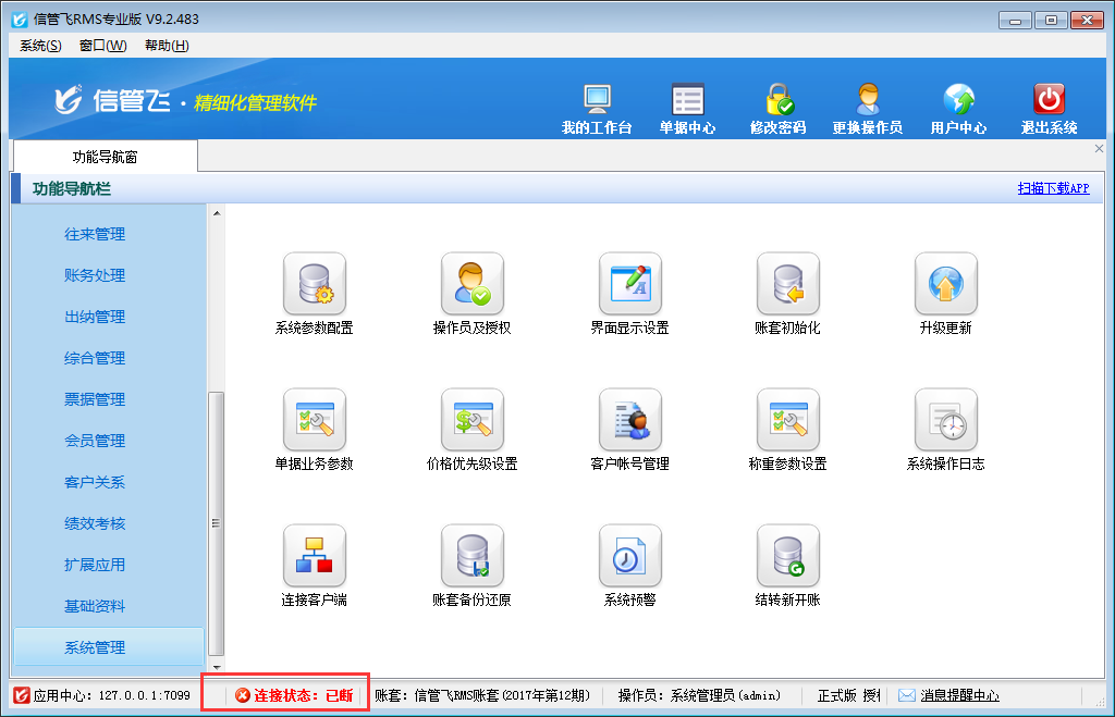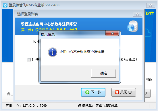 ????信管飛RMS、信管飛倉庫管理軟件、信管飛出納記賬軟件、信管飛送貨單軟件、信管飛票據打印軟件都包括客戶端程序和應用中心程序兩個模塊,客戶端程序登錄系統時,應用中心程序是必須打開的。如果主機電腦(網絡版用戶插入加密鎖的電腦為主機電腦)關機或關閉應用中心程序、程序出現異常等,客戶端程序與應用中心的連接就會斷開。應用中心程序再次正常運行后,客戶端程序需要重新建立與應用中心程序的連接。下面我們以信管飛RMS專業版為例介紹一下客戶端程序重連應用中心程序的操作。