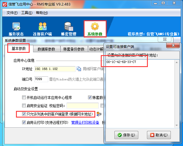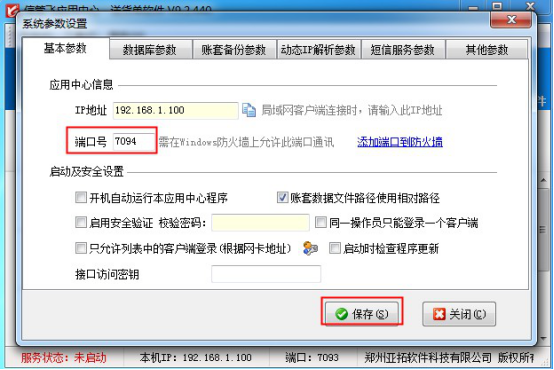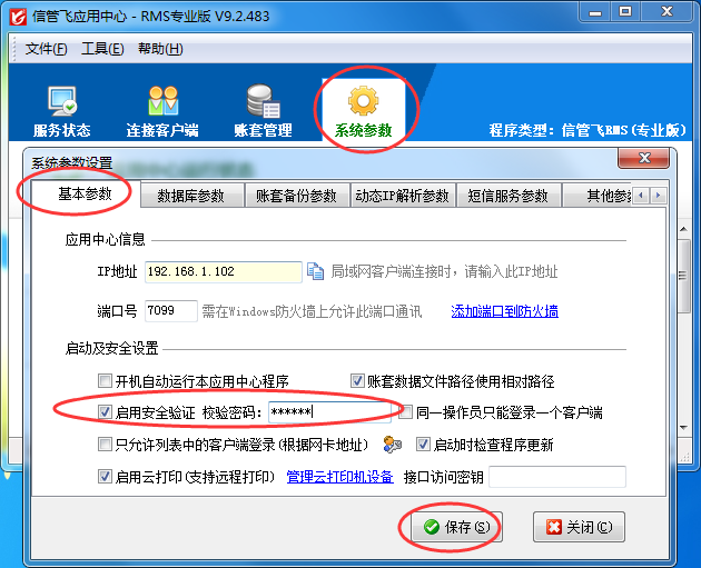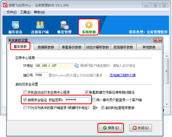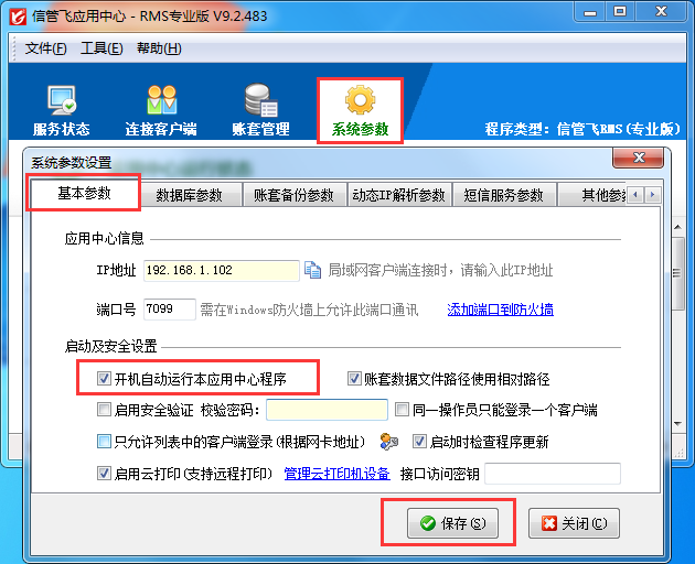 ????應用中心打開后會在電腦的右下角顯示,打開紅色圖標的應用中心,點擊“系統參數”會彈出各參數的設置界面,選擇“基本參數”在啟動與安全設置下勾選上“開機自動運行本應用中心程序”保存,則下次開機后會自動運行應用中心,操作如下圖所示: