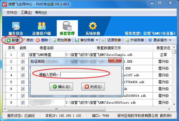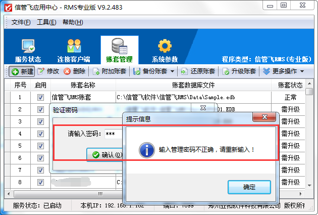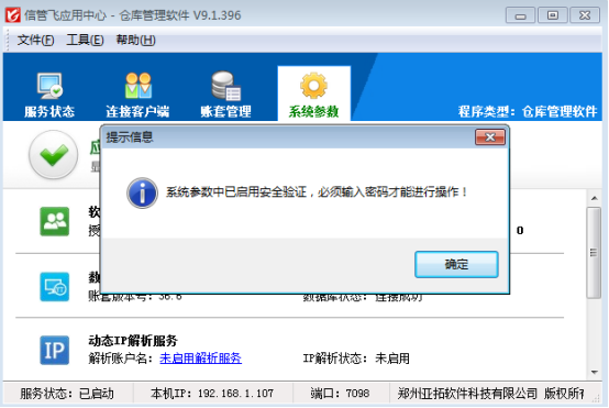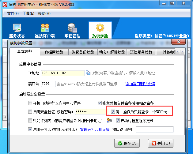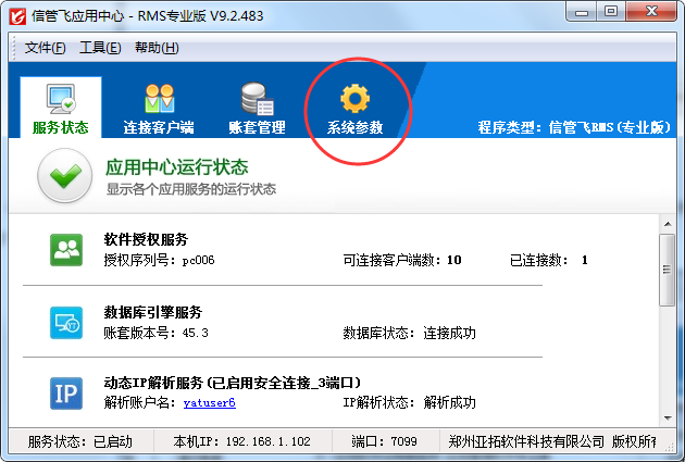 ????動態IP解析服務是亞拓軟件開發的基于互聯網的遠程連接解決方案,采用專屬安全技術,可以支持網絡版本在異地連接主機電腦進行共享數據使用。動態IP解析服務屬于增值服務,使用需要另外進行購買,購買后會分配解析賬號、管理密碼和使用口令信息,管理密碼和使用口令可以自己修改。下面我們以信管飛RMS為例介紹一下如何修改動態IP解析服務的管理密碼及使用口令。