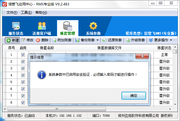 軟件安裝完成后,運行應用中心和客戶端程序,在應用中心界面,選擇賬套管理,顯示之前的所有賬套信息,賬套狀態為“需升級”,在賬套管理界面點擊升級下賬套,升級賬套不影響數據!(也可登錄時直接升級),如下圖所示: