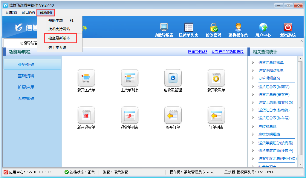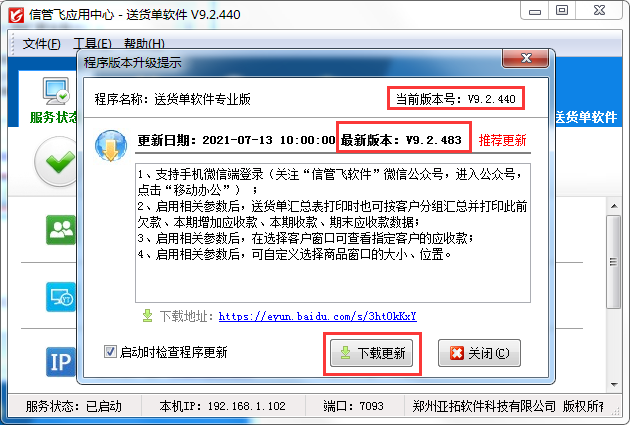 ????信管飛送貨單軟件、信管飛RMS軟件、信管飛倉庫管理軟件等都支持網絡版本(即可以多臺機器同時使用,數據共享,數據集中存儲在一臺機器上),軟件會不定期更新新版本,網絡版多臺電腦使用的時候,每次更新程序需要每臺電腦都下載最新版安裝程序進行安裝,非常麻煩。軟件支持在主機電腦的應用中心程序上指定更新安裝程序,便于客戶端登錄的時候如版本不一致會提示直接下載安裝程序。